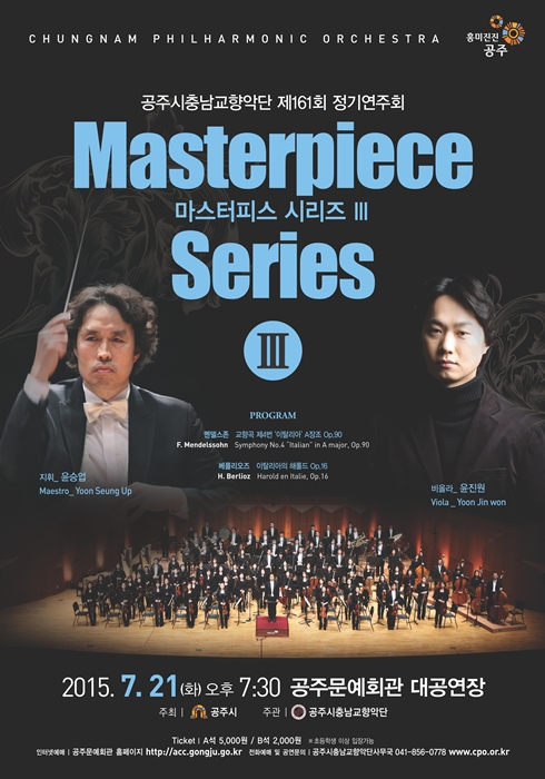 기획공연 공주시충남교향악단 제161회 정기연주회 <마스터피스 시리즈Ⅲ> 공연기간2015-07-21 공연예매2015-06-29 15:00 ~ 2015-07-21 15:00 공연시간19:30 / 70분 공연장소대공연장 티켓정보A석: 5,000원, B석: 2,000원 관람등급초등생이상 입장가능 공연주최공주시충남교향악단 공연문의공주시충남교향악단 041) 856-0778 공지사항 공연소개 프로그램 출연진