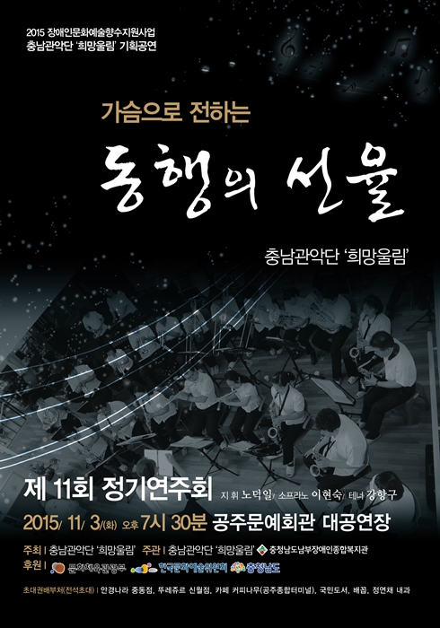 대관공연 충남관악단희망울림제11회정기연주회 공연기간2015-11-03 공연시간19:30 공연장소대공연장 공연주최충남관악단희망울림 공연문의041)856-7071 공지사항 공연소개 프로그램 출연진