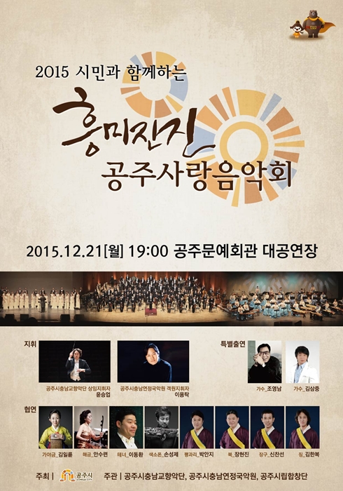 기획공연 2015 공주사랑음악회 공연기간2015-12-21 공연예매2015-12-18 10:00 ~ 2015-12-21 10:00 공연시간19:00 / 120분 공연장소대공연장 티켓정보전석무료 관람등급초등학생이상 공연주최문화시설사업소 공연문의공주문예회관 041-840-2180 공지사항 공연소개 프로그램 출연진