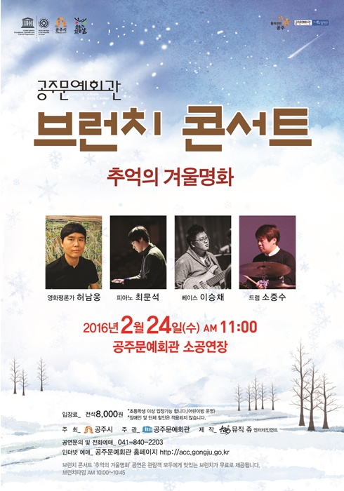 기획공연 브런치콘서트<추억의겨울명화> 공연기간2016-02-24 공연예매2016-02-17 15:00 ~ 2016-02-24 15:00 공연시간11:00 (브런치타임 10:00~10:45) / 70분 공연장소소공연장 티켓정보전석 8,000원 관람등급초등학생이상입장 가능 공연주최공주문예회관 공연문의041-840-2180 공지사항 공연소개 프로그램 출연진