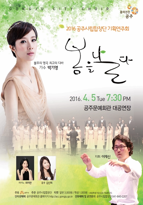 기획공연 공주시립합창단 기획연주회 봄을날다 공연기간2016-04-05 공연예매2016-03-22 15:00 ~ 2016-04-05 15:00 공연시간19:30 / 60분 공연장소대공연장 티켓정보일반3,000원 학생1,000원(학생할인은 현장에서 신분확인후 변경가능) 관람등급초등학생입장이상 공연주최공주시립합창단 공연문의041-840-2207 공지사항 공연소개 프로그램 출연진