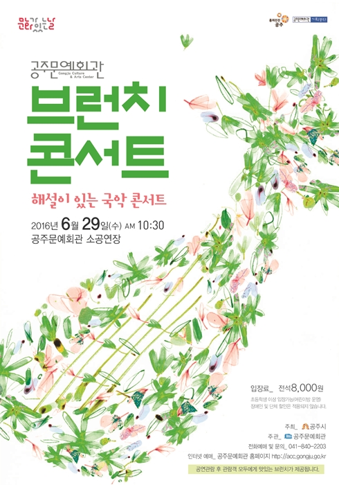 기획공연 브런치콘서트 <해설이 있는 국악콘서트> 공연기간2016-06-29 공연예매2016-06-21 15:00 ~ 2016-06-29 15:00 공연시간10:30 (공연관람 후 브런치 제공) / 60분 공연장소대공연장 티켓정보전석 8,000원 (장애인 및 단체할인 없음) 관람등급초등학생 이상 입장가능 공연주최공주문예회관 공연문의041-840-2203 공지사항 공연소개 프로그램 출연진