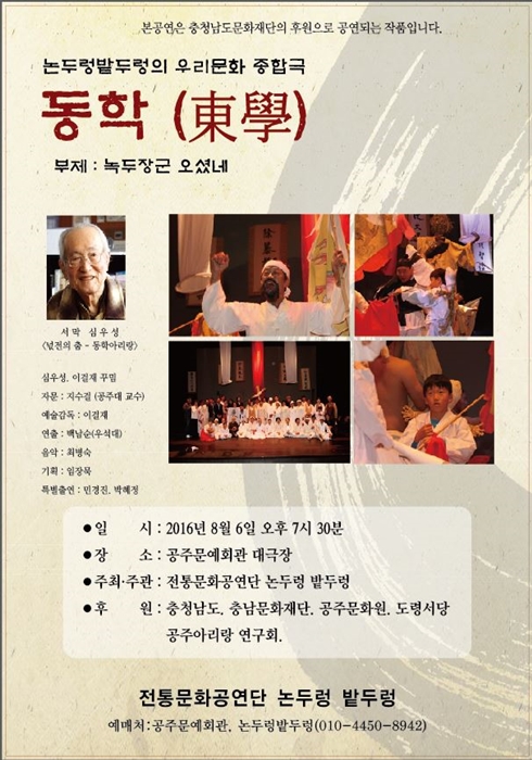 대관공연 동학(부제:녹두장군 오셨네) 공연기간2016-08-06 공연시간19:30 공연장소대공연장 공연주최전통문화공연단 논두렁밭두렁 공연문의논두렁밭두렁(010-4450-9842) 공지사항 공연소개 프로그램 출연진