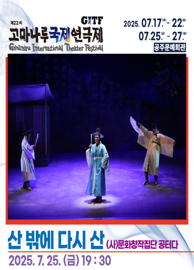 대관공연 제22회 고마나루국제연극제 [산 밖에 다시 산] 공연기간2025-07-25 공연시간19:30 공연장소대공연장 티켓정보무료 소요시간70분 공연주최공주시, (사)공주연극협회 공연주관고마나루국제연극제 집행위원회 공연장르연극 공연문의041-855-7519 공지사항 공연소개 프로그램 출연진