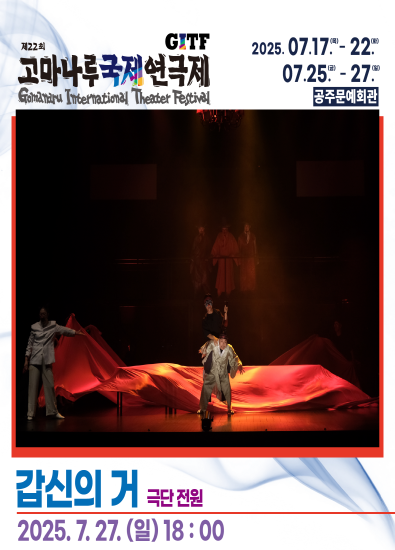 대관공연 제22회 고마나루국제연극제 [갑신의 거] 공연기간2025-07-27 공연시간18:00 공연장소대공연장 티켓정보무료 소요시간95분 공연주최공주시, (사)공주연극협회 공연주관고마나루국제연극제 집행위원회 공연장르연극 공연문의041-855-7519 공지사항 공연소개 프로그램 출연진