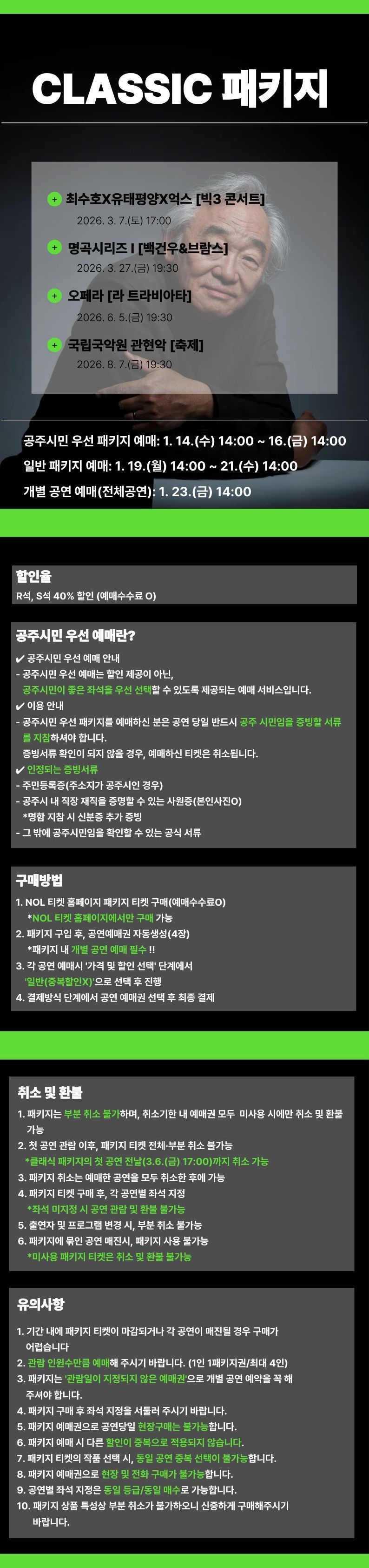 기획공연 클래식 패키지 공연기간2026-01-14 ~ 2026-01-21 공연예매2026-01-14 14:00 ~ 2026-01-21 공연시간공연별 상이 공연장소대공연장 티켓정보R석 114,000원 S석 72,000원 관람등급공연별 상이 공연주최공주문화관광재단 공연주관공주문예회관 공연문의041-852-6057 공지사항 공연소개 프로그램 출연진