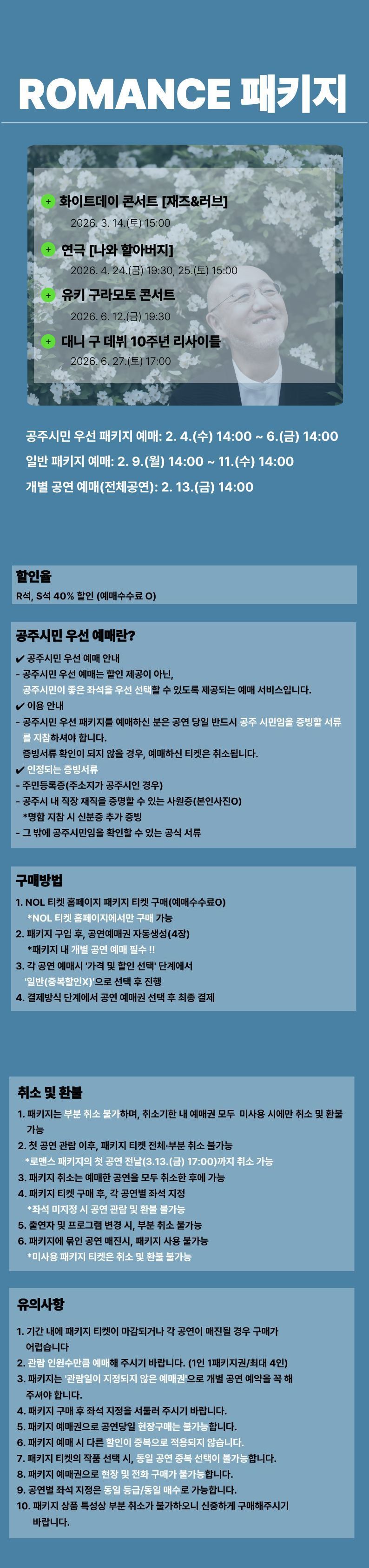 기획공연 로맨스 패키지 공연기간2026-02-04 ~ 2026-02-11 공연시간공연별 상이 공연장소대공연장 티켓정보R석 108,000원 S석 72,000원 관람등급공연별 상이 공연주최공주문화관광재단 공연주관공주문예회관 공연문의041-852-6057 공지사항 공연소개 프로그램 출연진 (공주시민) 패키지 예매 바로가기 2. 4.(수) 14:00 ~ 6.(금) 14:00 (일반) 패키지 예매 바로가기 2. 9.(월) 14:00 ~ 11.(수) 14:00 *패키지 예매는 NOL티켓(구.인터파크)에서만 가능합니다. *위에 바로가기를 누르시면 NOL 티켓 패키지 예매 화면으로 이동됩니다. *패키지 예매를 위해서는 NOL 티켓 회원 로그인이 필요합니다. *개별공연 예매 때에는 공주문예회관 홈페이지, NOL티켓에서 전부 가능합니다.
