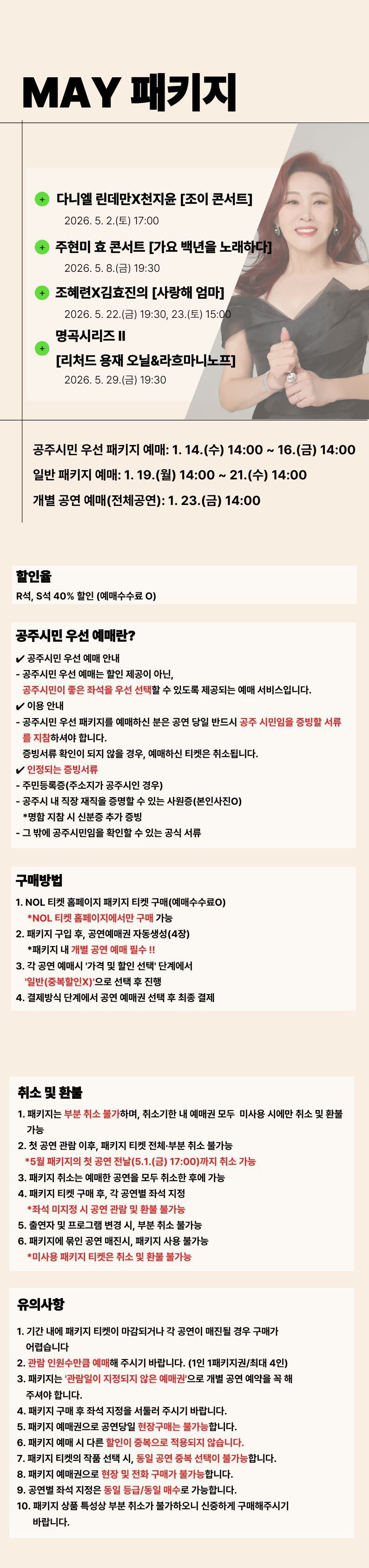 기획공연 메이 패키지 공연기간2026-01-14 ~ 2026-01-21 공연예매2026-01-14 14:00 ~ 2026-01-21 공연시간공연별 상이 공연장소대공연장 티켓정보R석 102,000원 S석 66,000원 관람등급공연별 상이 공연주최공주문화관광재단 공연주관공주문예회관 공연문의041-852-6057 공지사항 공연소개 프로그램 출연진