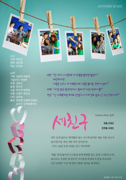 세친구 공연기간2017-09-01 공연시간19시30분 / 70분 공연장소소공연장 티켓정보무료 관람등급12세 아상 관람가능 공연주최(사)한국연극협회 공주시지부 공연문의010-4858-6791 공지사항 공연소개 프로그램 출연진