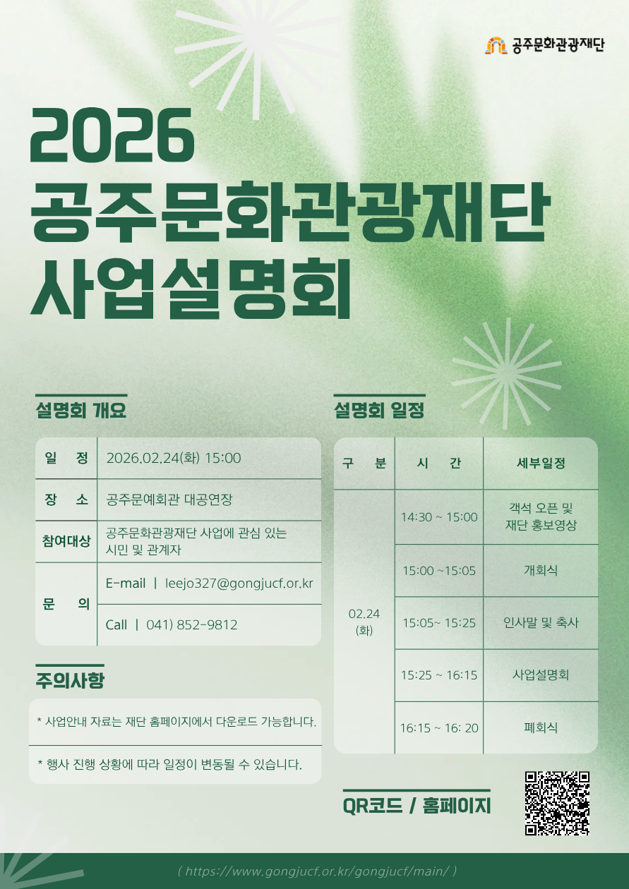 대관공연 공주문화관광재단 사업 설명회 공연기간2026-02-24 공연시간15:00 공연장소대공연장 티켓정보무료 공연주최공주문화관광재단 공연주관공주문화관광재단 문예진흥팀 공연문의041-852-9812 공지사항 공연소개 프로그램 출연진