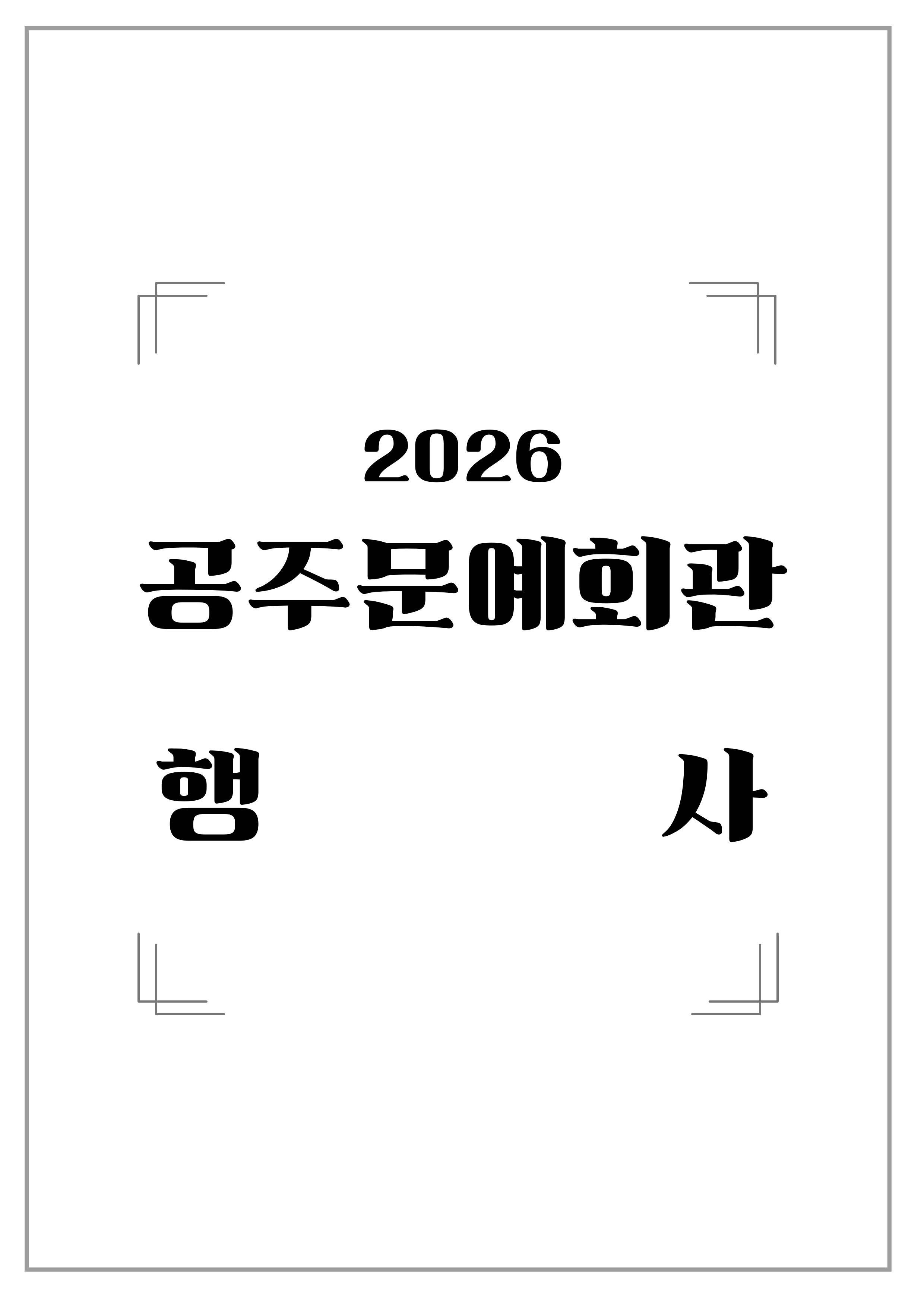 대관공연 2026년 노인일자리 발대식 및 교육 공연기간2026-02-26 공연시간10:00 공연장소대공연장 공연주최(사)대한노인회 공주시지회 공연주관(사)대한노인회 공주시지회 공지사항 공연소개 프로그램 출연진