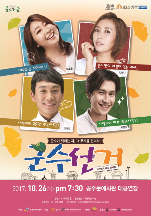 기획공연 군수선거 공연기간2017-10-26 공연예매2017-10-18 15:00 ~ 2017-10-26 15:00 공연시간19:30분 / 110분 공연장소대공연장 티켓정보전석 10.000원 관람등급초등학교이상 공연주최공주시, 한국문화예술연합회 공연문의041-840-2227 공지사항 공연소개 프로그램 출연진