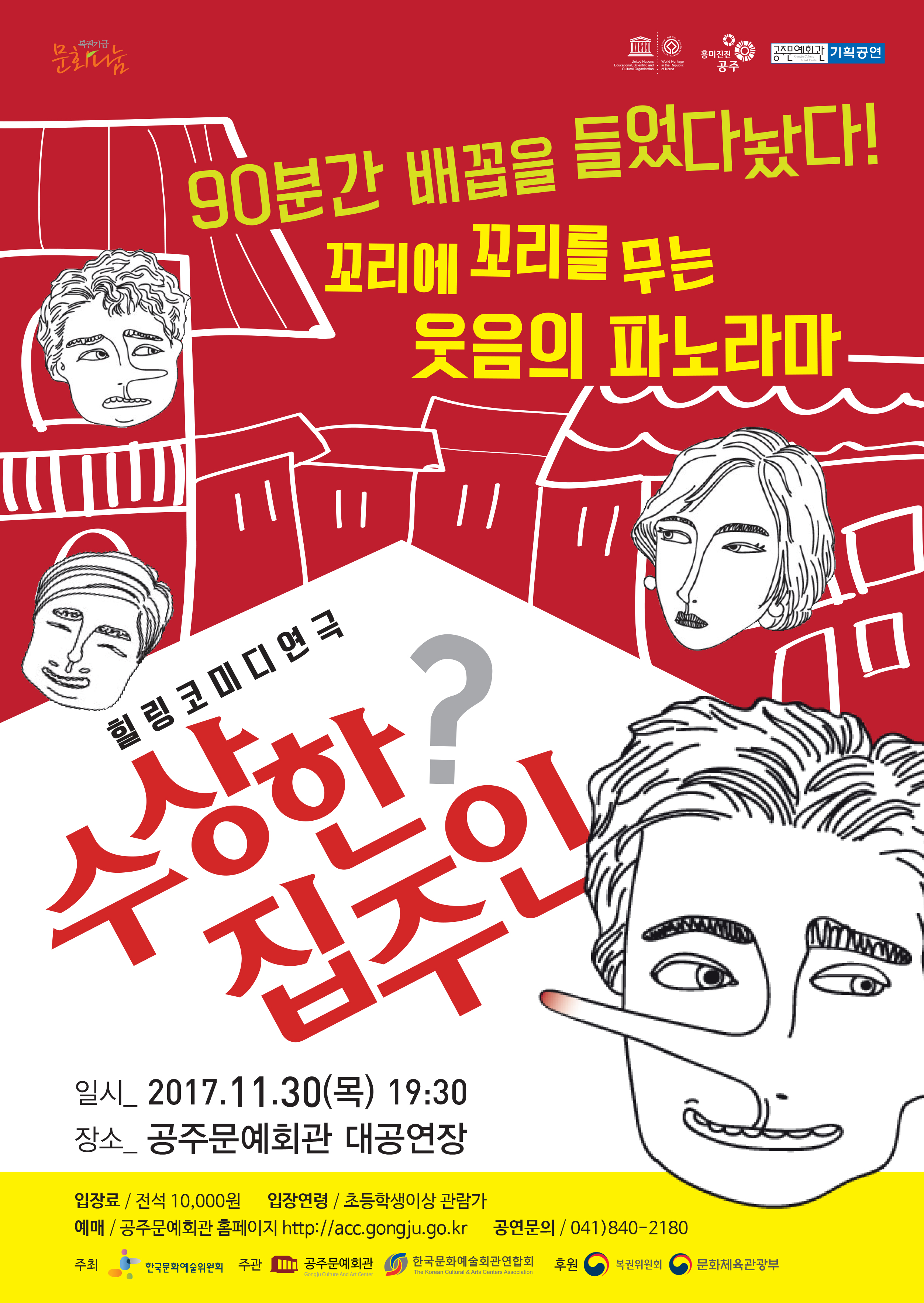 기획공연 힐링코미디연극 [수상한집주인] 공연기간2017-11-30 공연예매2017-11-13 11:00 ~ 2017-11-30 11:00 공연시간PM 07:30(1회) / 90분 공연장소대공연장 티켓정보전석 1만원 관람등급초등학생이상 관람가 공연주최공주시,공주시문화시설사업소(공주문예회관) 공연문의041-840-2227 공지사항 공연소개 프로그램 출연진