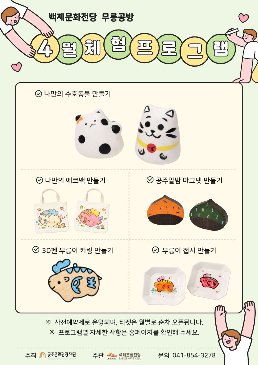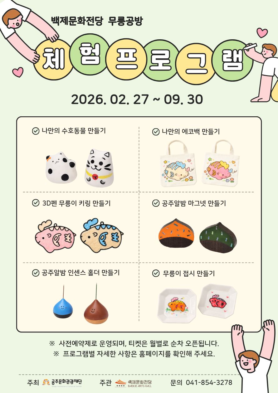 전체 3건 (1/1) 검색 조건 선택 제목 내용 검색어 입력 검색 버튼 무릉공방 체험 프로그램 2026-02-27~2026.09.30 학습실 [4월 개관기념 특별운영] 무릉공방 체험 프로그램 2026-04-01~2026.04.30 학습실 [개관기념 특별운영] 전시 & 체험 프로그램 2026-04-01~2026.09.30 학습실