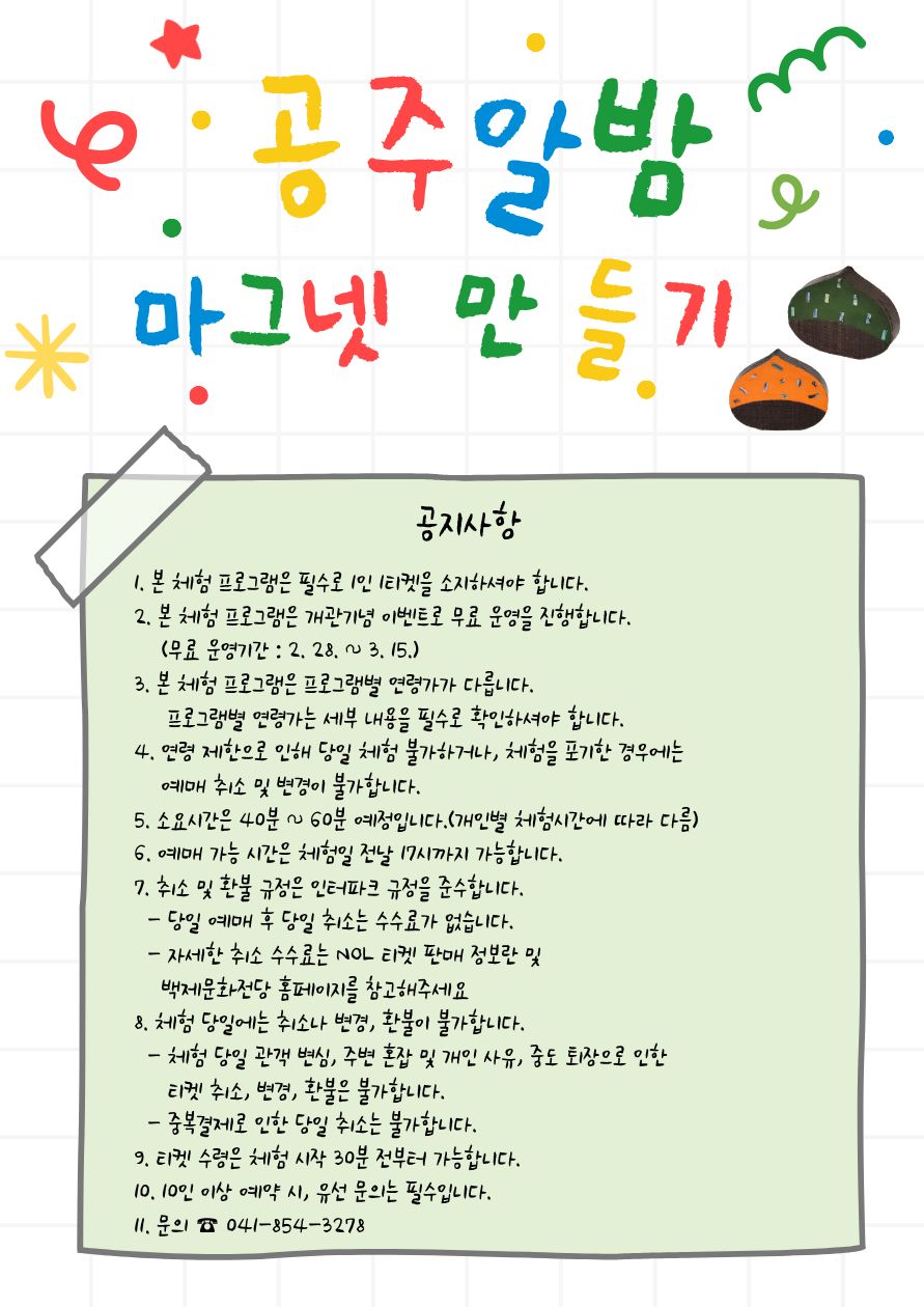 [공지사항] - 백제문화전당 개관을 기념하여 2. 28.(토) ~ 3. 15.(일)까지 무료로 운영합니다. - 티켓 오픈 일시: 2026. 2. 24.(화) 14:00 예정 * 티켓 예매는 백제문화전당 홈페이지에서만 가능합니다. * 상기 티켓 오픈 일정은 무릉공방 운영 사정에 의해 변경될 수 있습니다. |