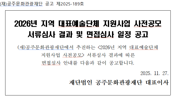 2026년 지역대표예술단체 지원사업 사전공모 서류심사 결과 및 면접심사 일정 안내