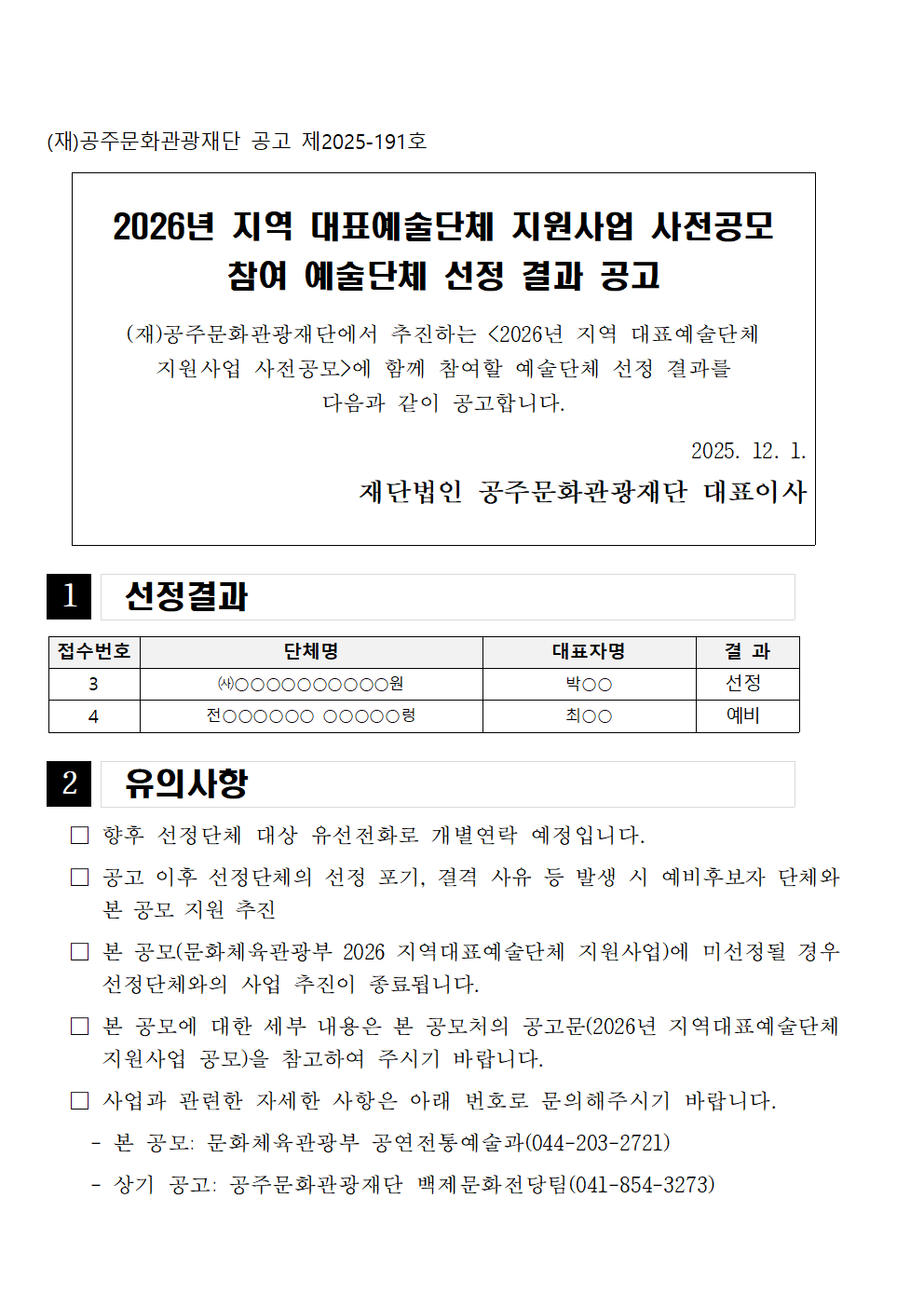 2026 지역대표예술단체 지원사업 사전공모 참여 예술단체 선정 결과공고