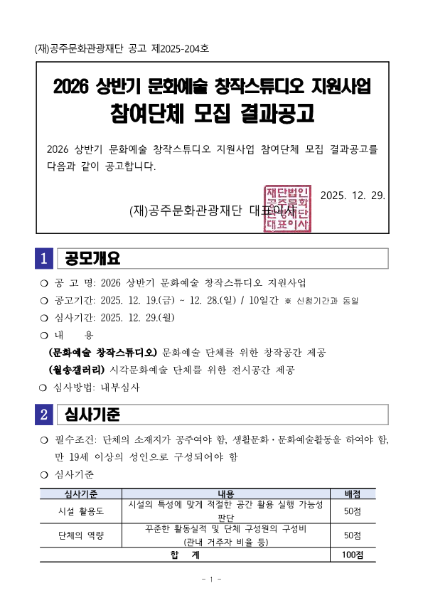 2026 상반기 문화예술 창작스튜디오 지원사업 참여단체 모집결과