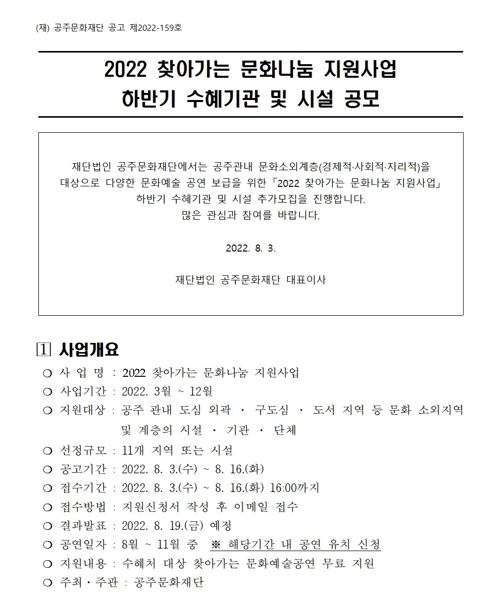 2022 찾아가는 문화나눔 지원사업 하반기 수혜기관 및 시설 모집 공고