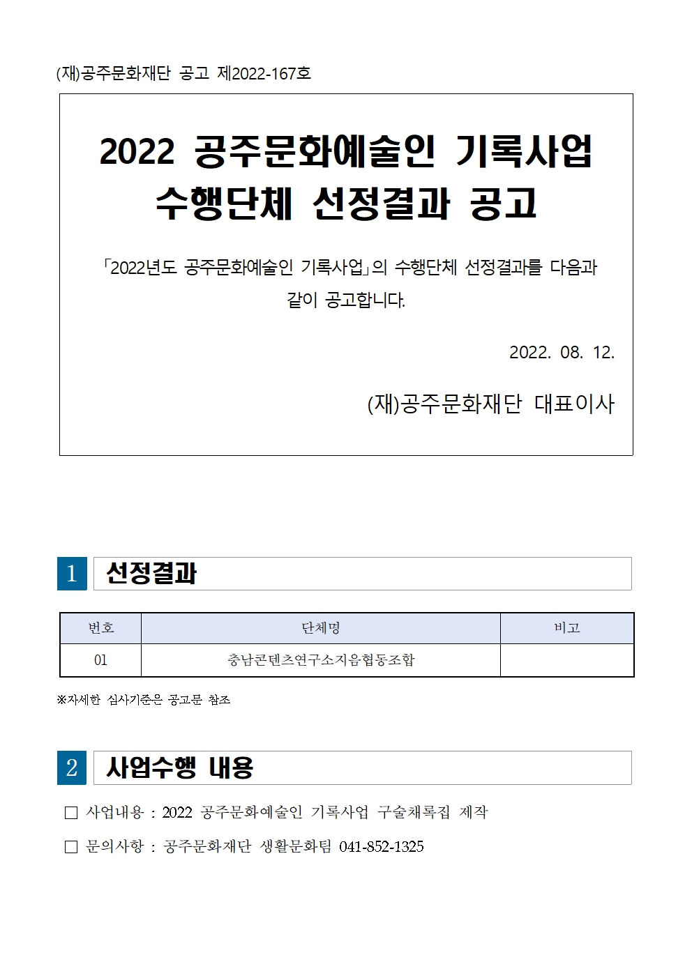 2022 공주문화예술인 기록사업 수행단체 최종 선정결과 공고