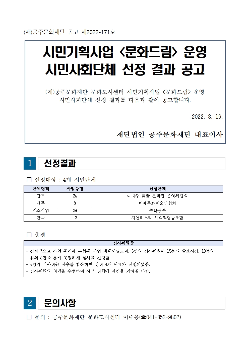 시민기획사업 <문화드림> 운영 시민사회단체 선정 결과 공고