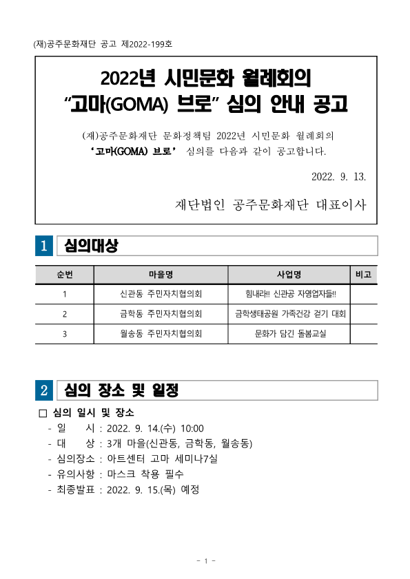 2022년 시민문화 월례회의 '고마(GOMA) 브로' 심의 안내 공고
