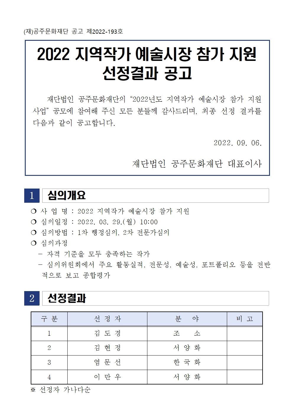 2022 지역작가 예술시장 참가 지원 선정결과 공고