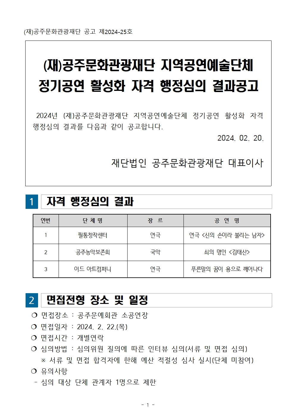 2024년 지역공연예술단체 정기공연활성화 행정심의 결과 및 면접심의 공고