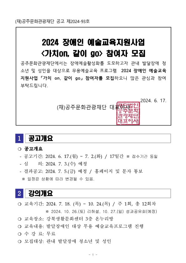 2024 장애인 예술교육지원사업 <가치on, 같이 go> 참여자 모집