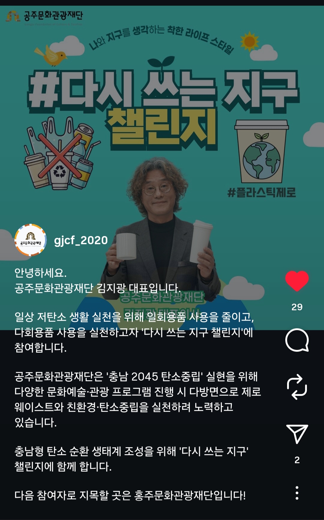 충남 광역-기초문화관광재단이 협력하여 일상 저탄소 생활 실천을 위한 일회용품 사용 근절 챌린지 '#다시 쓰는 지구' 를 추진하였습니다.