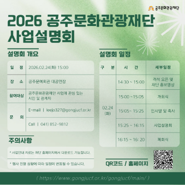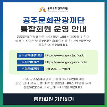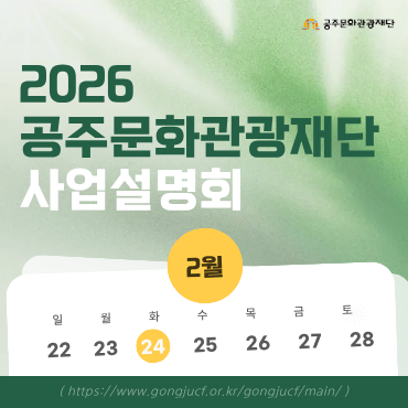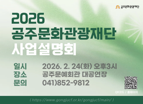 SCROLL DOWN 이전 다음 정지 재생 알려드립니다 NEWS & NOTICE 공지사항 입찰공고 채용공고 보도자료 More 공지사항 공지사항 (재)공주문화관광재단 금고 협력사업비 총액 공고 2026-02-20 공지사항 공주문화관광재단 홈페이지 통합회원 전환 안내 2026-02-13 공지사항 2026년 (재)공주문화관광재단 관광콘텐츠팀 제안서 평가위원(후보자) 통합 모집 공고 2026-01-29 공지사항 재미있는 공주를 쌓아온 5년의 기록 / 공주문화관광재단 5년사 2026-01-28 입찰공고 입찰공고 2026년 공주 올해의 사진 작가전 선정결과 공고 2026-02-20 입찰공고 2026 문화도시 시민모니터링단 <더: 봄> 6기 참여자 모집 공고 2026-02-12 입찰공고 2026 1st 공주그림상점로 참여예술인모집 공고 2026-02-11 입찰공고 2026 꿈의 오케스트라 공주 전문 교육인력 주강사 최종합격자 발표 2026-02-09 채용공고 채용공고 2026년 (재)공주문화관광재단 제1회 직원 및 제2회 기간제근로자 채용 최종합격자 공고 2026-02-20 채용공고 2026년 재단 제1회 직원 및 제2회 기간제근로자 채용 면접전형 일정 변경 공고 2026-02-12 채용공고 2026년 (재)공주문화관광재단 제1회 직원 채용 필기(논술)전형 합격자 및 면접전형 공고 2026-02-11 채용공고 2026년 (재)공주문화관광재단 제2회 기간제근로자 채용 서류전형 합격자 및 면접전형 공고 2026-02-06 보도자료 보도자료 2026 시즌 오프닝 콘서트 ‘신세계 교향곡&카르미나 부라나’ 개최 2026-02-05 보도자료 백제문화전당 전시장(비단뜰) 막바지 작업 한창 2026-01-29 보도자료 공주문화관광재단, 백제문화전당 ‘무릉이’ 캐릭터 개발 완료 2026-01-05 보도자료 2025 공유전시-색으로 행복을 그린 앙리 마티스 레플리카 전시 개최 2025-12-22 POPUP ZONE 문화사업 바로가기 관광사업 바로가기 대관안내 바로가기 진행중인 행사 공주문화관광재단에서 이달의 공연ㆍ전시ㆍ행사를 안내해드립니다 More ALL PERFORMANCE EXHIBITION EVENT ALL PERFORMANCE EXHIBITION EVENT 기관위치 공주문화관광재단 운영시설 위치 정보를 안내해드립니다. 공주문화관광재단(아트센터고마) 공주문예회관 호서극장(예정) 백제문화전당 강북생활문화센터 공주문화예술촌 SNS소식 공주문화관광재단의 다양한 소식을 만나보세요. 2026년도 공주문화관광재단 사업설명회 홍보영상보기 TOP 확인 예 아니오 메인 팝업 영역 오늘 하루 열지 않기 닫기