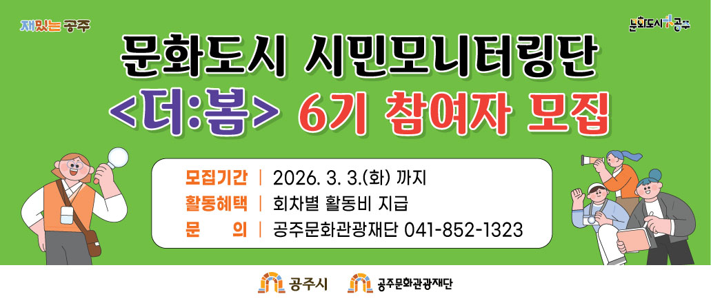 알려드립니다 NEWS & NOTICE 공지사항 입찰공고 채용공고 보도자료 More 공지사항 공지사항 (재)공주문화관광재단 금고 협력사업비 총액 공고 2026-02-20 공지사항 공주문화관광재단 홈페이지 통합회원 전환 안내 2026-02-13 공지사항 2026년 (재)공주문화관광재단 관광콘텐츠팀 제안서 평가위원(후보자) 통합 모집 공고 2026-01-29 공지사항 재미있는 공주를 쌓아온 5년의 기록 / 공주문화관광재단 5년사 2026-01-28 입찰공고 입찰공고 2026년 공주 올해의 사진 작가전 선정결과 공고 2026-02-20 입찰공고 2026 문화도시 시민모니터링단 <더: 봄> 6기 참여자 모집 공고 2026-02-12 입찰공고 2026 1st 공주그림상점로 참여예술인모집 공고 2026-02-11 입찰공고 2026 꿈의 오케스트라 공주 전문 교육인력 주강사 최종합격자 발표 2026-02-09 채용공고 채용공고 2026년 (재)공주문화관광재단 제1회 직원 및 제2회 기간제근로자 채용 최종합격자 공고 2026-02-20 채용공고 2026년 재단 제1회 직원 및 제2회 기간제근로자 채용 면접전형 일정 변경 공고 2026-02-12 채용공고 2026년 (재)공주문화관광재단 제1회 직원 채용 필기(논술)전형 합격자 및 면접전형 공고 2026-02-11 채용공고 2026년 (재)공주문화관광재단 제2회 기간제근로자 채용 서류전형 합격자 및 면접전형 공고 2026-02-06 보도자료 보도자료 2026 시즌 오프닝 콘서트 ‘신세계 교향곡&카르미나 부라나’ 개최 2026-02-05 보도자료 백제문화전당 전시장(비단뜰) 막바지 작업 한창 2026-01-29 보도자료 공주문화관광재단, 백제문화전당 ‘무릉이’ 캐릭터 개발 완료 2026-01-05 보도자료 2025 공유전시-색으로 행복을 그린 앙리 마티스 레플리카 전시 개최 2025-12-22 POPUP ZONE 문화사업 바로가기 관광사업 바로가기 대관안내 바로가기