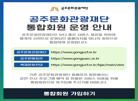 사이트 전체메뉴 알림마당 공지사항 사업공모·입찰 채용공고 보도자료 사회공헌 재단 갤러리 문화행사정보 전체일정 공연 전시 문화행사 기타 문화사업 문화예술진흥사업 문화사업 강북생활문화센터 사업 아트센터고마 사업 공주문화예술촌 사업 공주문예회관 사업 문화도시 조성사업 관광사업 관광진흥 사업 관광마케팅 사업 서부내륙권 관광진흥사업 백제문화전당 사업 관광사업안내·신청 반려동물 친화관광 공주 문화관광 공주 국가유산 야행 국가유산 미디어아트 대관안내 아트센터고마 공주문예회관 대관공고 기관소개 개요 BI소개 비전미션 조직 및 담당업무 시설안내 경영공시 조례·정관·제규정 ESG 인권경영 후원 오시는길