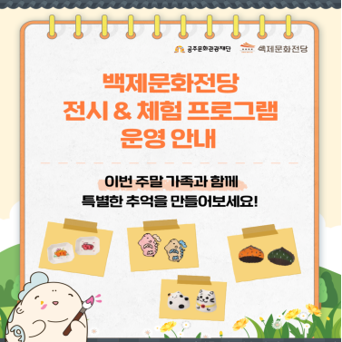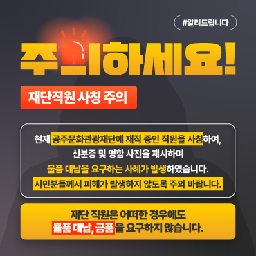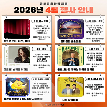 SCROLL DOWN 이전 다음 정지 재생 알려드립니다 전체 공지사항 사업·입찰 채용공고 보도자료 More 전체 2026 공주생활문화축제 참여단체 선정 심사결과 공고 사업공모 2026-04-15 2026 상설거리공연 참여 예술단체 서류 합격자 공고 및 2차 심사 변경 공고 사업공모 2026-04-13 2026년 백제문화전당 기념품숍 입점작가 모집공고 사업공모 2026-04-13 2026 백제문화전당 안내원 2차모집 최종합격자 공고 채용공고 2026-04-09 2026 생활문화예술 활성화사업 참여단체 심사결과 공고 사업공모 2026-04-09 공지사항 백제문화전당 브랜드 상설공연 '뮤지컬 <더킹: 무령> 시민배우 모집 공지사항 2026-03-09 (재)공주문화관광재단 금고 협력사업비 총액 공고 공지사항 2026-02-20 공주문화관광재단 홈페이지 통합회원 전환 안내 공지사항 2026-02-13 2026년 (재)공주문화관광재단 관광콘텐츠팀 제안서 평가위원(후보자) 통합 모집 공고 공지사항 2026-01-29 재미있는 공주를 쌓아온 5년의 기록 / 공주문화관광재단 5년사 공지사항 2026-01-28 입찰공고 2026 공주생활문화축제 참여단체 선정 심사결과 공고 사업공모 2026-04-15 2026 상설거리공연 참여 예술단체 서류 합격자 공고 및 2차 심사 변경 공고 사업공모 2026-04-13 2026년 백제문화전당 기념품숍 입점작가 모집공고 사업공모 2026-04-13 2026 생활문화예술 활성화사업 참여단체 심사결과 공고 사업공모 2026-04-09 2026년 공주 이시대의 사진작가전 선정결과 공고 사업공모 2026-04-08 채용공고 2026 백제문화전당 안내원 2차모집 최종합격자 공고 채용공고 2026-04-09 2026년 (재)공주문화관광재단 제4회 기간제근로자 채용 공고 채용공고 2026-04-06 2026 백제문화전당 안내원 2차모집 면접대상자 공고 채용공고 2026-04-01 2026 꿈의 무용단 공주 전문 교육인력 채용 최종합격자 공고 채용공고 2026-03-27 2026년 (재)공주문화관광재단 제3회 기간제근로자 채용 최종합격자 공고 채용공고 2026-03-27 보도자료 공주문예회관, 2026 기획공연 ‘명곡 시리즈’ 개최 보도자료 2026-03-13 2026 시즌 오프닝 콘서트 ‘신세계 교향곡&카르미나 부라나’ 개최 보도자료 2026-02-05 백제문화전당 전시장(비단뜰) 막바지 작업 한창 보도자료 2026-01-29 공주문화관광재단, 백제문화전당 ‘무릉이’ 캐릭터 개발 완료 보도자료 2026-01-05 2025 공유전시-색으로 행복을 그린 앙리 마티스 레플리카 전시 개최 보도자료 2025-12-22 POPUP ZONE 문화사업 바로가기 관광사업 바로가기 대관안내 바로가기 진행중인 행사 공주문화관광재단에서 이달의 공연ㆍ전시ㆍ행사를 안내해드립니다 More ALL PERFORMANCE EXHIBITION EVENT ALL PERFORMANCE EXHIBITION EVENT SNS소식 공주문화관광재단의 다양한 소식을 만나보세요. 백제문화전당 전시&체험 프로그램 운영 안내 2026년 4월 행사 안내 백제문화전당 메인 홍보영상 공주문화관광재단 홍보영상 기관위치 공주문화관광재단 운영시설 위치 정보를 안내해드립니다. 공주문화관광재단(아트센터고마) 공주문예회관 호서극장 백제문화전당 강북생활문화센터 공주문화예술촌 홍보영상보기 TOP 확인 예 아니오 메인 팝업 영역 오늘 하루 열지 않기 닫기