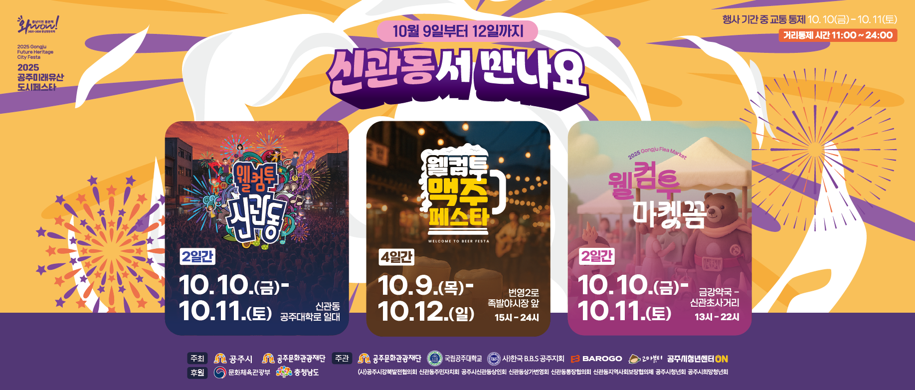 SCROLL DOWN 이전 다음 진행중인 행사 공주문화관광재단에서 이달의 공연ㆍ전시ㆍ행사를 안내해드립니다 More ALL PERFORMANCE EXHIBITION EVENT ALL PERFORMANCE EXHIBITION EVENT 알려드립니다 NEWS & NOTICE 공지사항 입찰공고 채용공고 보도자료 More 공지사항 공지사항 2025 미래유산도시브랜딩 공주 핫스팟 포토존: 가을, 겨울편 촬영 참여자 모집 2025-09-29 공지사항 2026년 공주아츠페스티벌 공모 2025-09-25 공지사항 2026년 상반기 공주문예회관 정기대관 공고 2025-09-24 공지사항 2025년 휴먼유산 꾼 양성 <꾼 매니지먼트: 로컬 브랜드> 참여자 3차 모집 공고 2025-09-19 입찰공고 입찰공고 2025 하반기 문화예술 창작스튜디오 지원사업 참여단체 선정 결과공고 2025-07-02 입찰공고 2025 상반기 문화예술 창작스튜디오 지원사업 참여단체 모집 결과공고 2024-12-31 입찰공고 2025 상반기 문화예술 창작스튜디오 지원사업 참여단체 모집공고 2024-12-17 입찰공고 2025년도 공주문화예술촌 레지던시 입주작가 모집 최종합격자 공고 2024-12-16 채용공고 채용공고 2025 미래유산학당 <문화인력 인턴십 프로그램> 하반기 최종합격자 공고 2025-09-03 채용공고 2025미래유산학당<문화인력 인턴십 프로그램>하반기 참여자 서류합격자 및 면접전형 공고 2025-08-22 채용공고 2025년 (재)공주문화관광재단 제6회 기간제근로자 채용 최종합격자 공고 2025-07-28 채용공고 2025 미래유산학당 <문화인력 인턴십 프로그램> 하반기 참여자 모집 공고 2025-07-28 보도자료 보도자료 2025 디지털헤리티지페스타 with AI, 9월 26일 공주에서 개막 2025-09-25 보도자료 공주문화예술촌 레지던시 입주예술가 릴레이 개인전 "남기승 <검은 창 붕괴>" 개최 2025-09-19 보도자료 공주문화예술촌 최수빈 릴레이전 2025-06-26 보도자료 ‘10주년 꿈의 오케스트라 공주’, 국립공주병원 공연 성료 2025-06-25 POPUP ZONE 문화사업 바로가기 관광사업 바로가기 대관안내 바로가기 기관위치 공주문화관광재단 운영시설 위치 정보를 안내해드립니다. 공주문화관광재단(아트센터고마) 공주문예회관 호서극장(예정) 백제문화전당(예정) 강북생활문화센터 공주문화예술촌 SNS소식 공주문화관광재단의 다양한 소식을 만나보세요. 청파 이은구_器에 담은 氣의 예술 공주문화관광재단 홍보영상 홍보영상보기 TOP 확인 예 아니오 메인 팝업 영역 오늘 하루 열지 않기 닫기